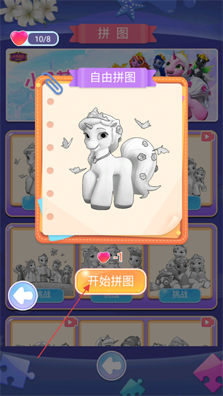 1、進(jìn)入拼圖界面,查看左上角愛心數(shù)量10/8,選擇自由拼圖,點(diǎn)擊開始拼圖按鈕。