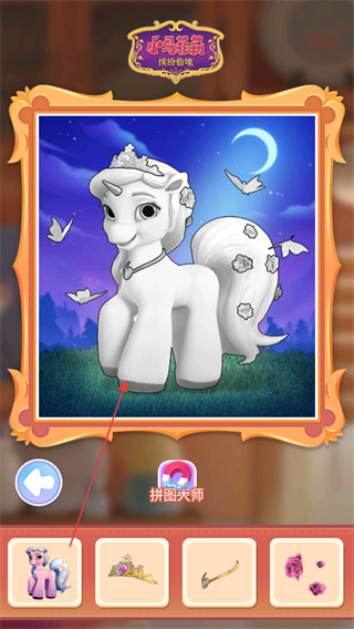 2、按照輪廓和圖案提示,在空白拼圖區(qū)域拼接小馬圖案,完成基礎(chǔ)拼圖。