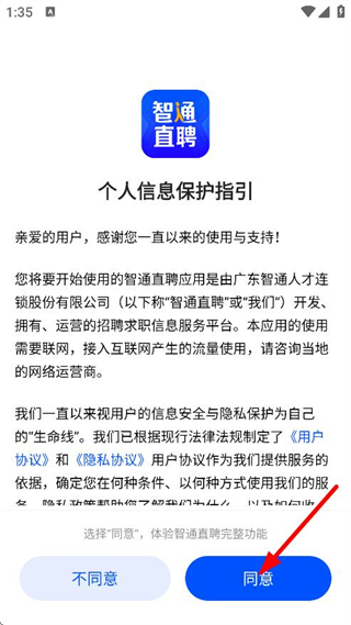 1、在智通直聘APP的個(gè)人信息保護(hù)指引頁(yè)面,點(diǎn)擊同意,進(jìn)入登錄頁(yè)面。