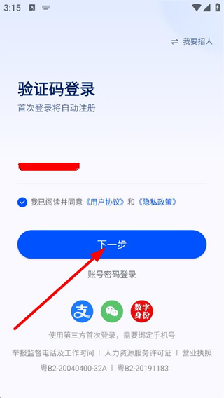 2、在驗(yàn)證碼登錄頁(yè)面,輸入手機(jī)號(hào)后點(diǎn)擊下一步,進(jìn)入輸入短信驗(yàn)證碼頁(yè)面。