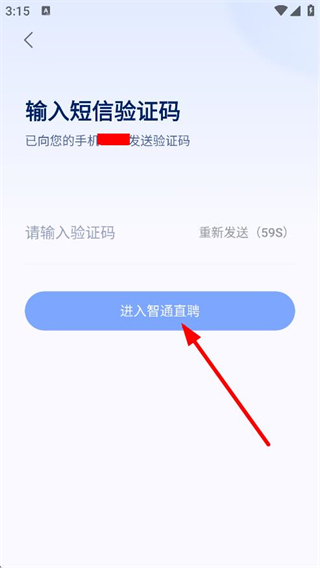 3、在輸入短信驗(yàn)證碼頁(yè)面,輸入收到的驗(yàn)證碼后,點(diǎn)擊進(jìn)入智通直聘,完成登錄操作。