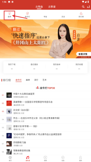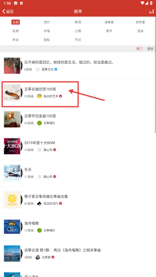 3、在曲單列表中,選擇古箏名曲欣賞100首曲單,進(jìn)入曲目列表頁(yè)。