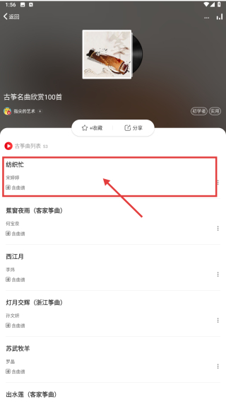 4、在曲目列表頁(yè),點(diǎn)擊紡織忙曲目,開始欣賞或?qū)W習(xí)該古箏曲。