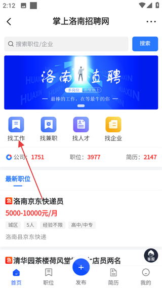 2、在掌上洛南招聘網(wǎng)頁面,點擊找工作,進入最新職位頁面。