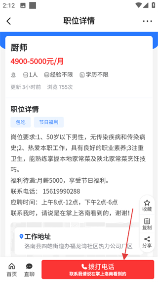4、在職位詳情頁,可查看職位信息,點擊撥打電話,聯(lián)系招聘方完成求職。
