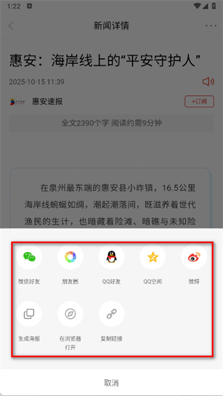4、在分享選項中,選擇微信好友、朋友圈等平臺分享新聞。