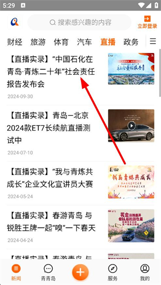 2、在直播內(nèi)容列表頁(yè)面,點(diǎn)擊直播實(shí)錄中國(guó)石化在青島·青煉二十年社會(huì)責(zé)任報(bào)告發(fā)布會(huì),進(jìn)入該直播詳情頁(yè)面。