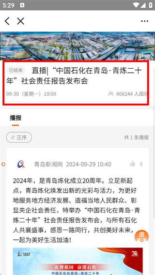3、在直播詳情頁(yè)面,可查看中國(guó)石化在青島·青煉二十年社會(huì)責(zé)任報(bào)告發(fā)布會(huì)的直播相關(guān)信息及播報(bào)內(nèi)容。