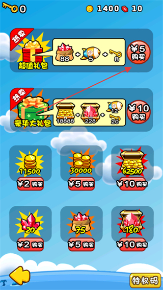 商店里提供超值禮包、豪華大禮包等多種禮包,包含寶石、金幣、鑰匙等不同道具,玩家可根據(jù)需求選擇購買,助力游戲闖關(guān)與角色養(yǎng)成。