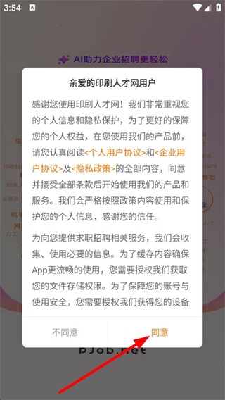 1、在印刷人才網的個人信息保護指引彈窗中,點擊同意,進入登錄注冊頁面。