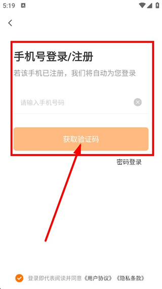 2、在手機號登錄/注冊頁面,輸入手機號后點擊獲取驗證碼,進入輸入驗證碼頁面。