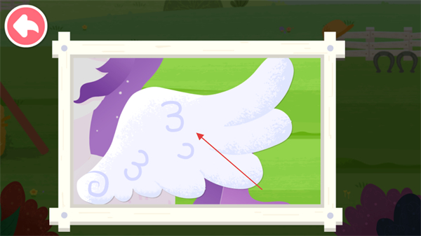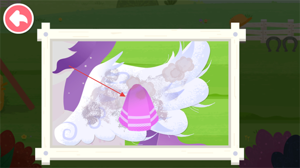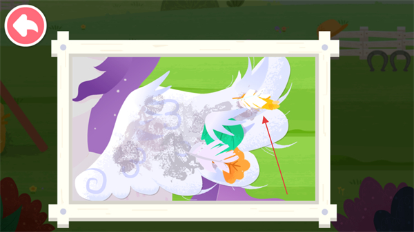 1、進入小馬繪畫修復(fù)關(guān)卡,觀察帶有污漬的小馬翅膀畫作,找到需要修復(fù)的部位。