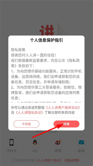 1、在個人信息保護指引彈窗中,點擊同意,進入登錄方式選擇頁面。