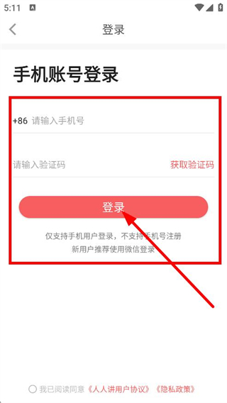 3、在手機賬號登錄頁面,輸入手機號、驗證碼后,點擊登錄,完成登錄操作。