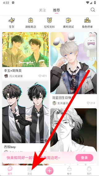 1、打開畫包包,在首頁瀏覽推薦的二次元文創(chuàng)內(nèi)容,點(diǎn)擊底部集市周邊,進(jìn)入商品展示頁面。