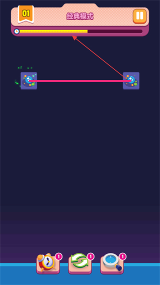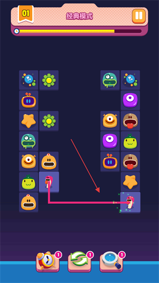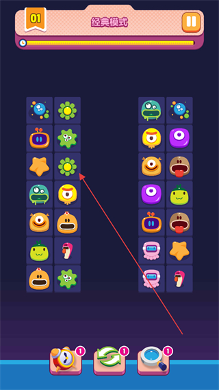 1、進(jìn)入游戲,選擇經(jīng)典模式,查看關(guān)卡進(jìn)度如01,在界面中找到兩個(gè)相同的圖案。
