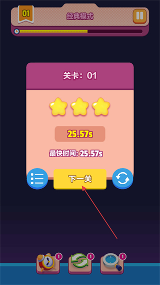 4、在規(guī)定時(shí)間內(nèi)消除所有圖案后,根據(jù)用時(shí)獲得星級(jí)評(píng)價(jià),點(diǎn)擊下一關(guān)按鈕進(jìn)入下一關(guān)挑戰(zhàn)。