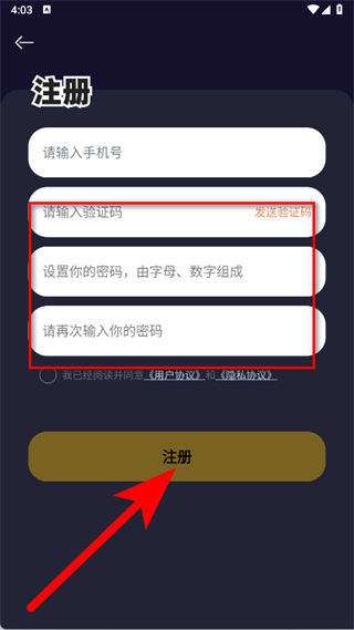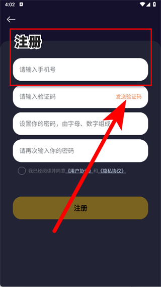3、在注冊頁面,輸入手機(jī)號(hào),點(diǎn)擊發(fā)送驗(yàn)證碼,然后輸入收到的驗(yàn)證碼。