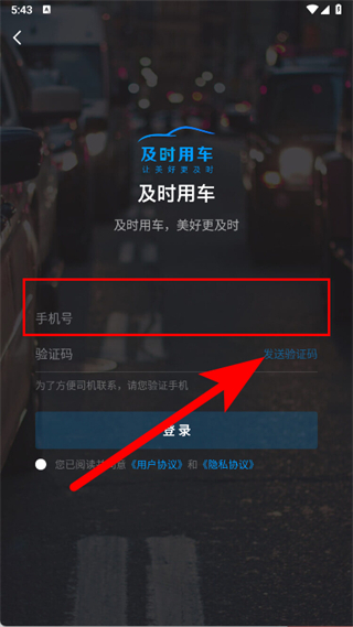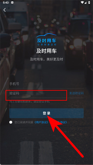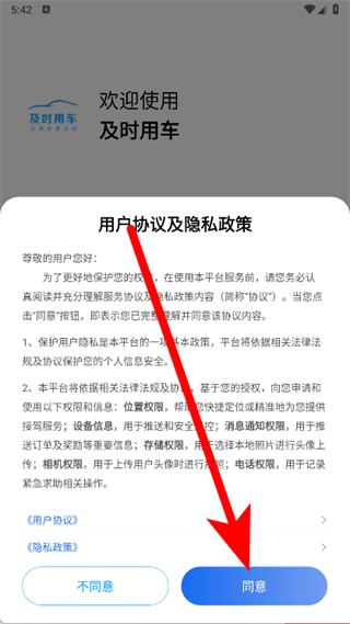 1、打開及時(shí)用車,在彈出的窗口中,認(rèn)真閱讀協(xié)議內(nèi)容后點(diǎn)擊同意按鈕。