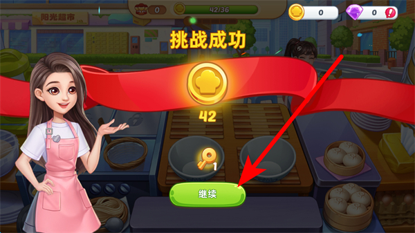 3、完成一個關(guān)卡挑戰(zhàn)后,會顯示挑戰(zhàn)成功,此時點擊繼續(xù),可進入后續(xù)關(guān)卡或環(huán)節(jié),持續(xù)餐廳經(jīng)營之旅。