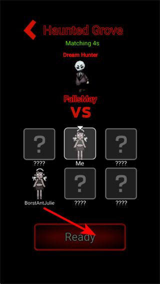 2、在對戰(zhàn)匹配界面,點(diǎn)擊Ready按鈕,準(zhǔn)備進(jìn)入Haunted Grove的對戰(zhàn)模式,與其他玩家或敵人展開對決。