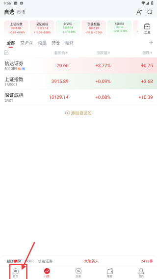1、打開證券類應用,點擊底部首頁選項,進入首頁功能頁面。