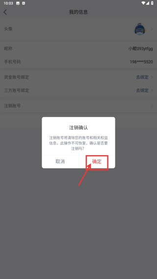 4、在注銷確認(rèn)彈窗中,點(diǎn)擊確定按鈕,完成賬號(hào)注銷操作。