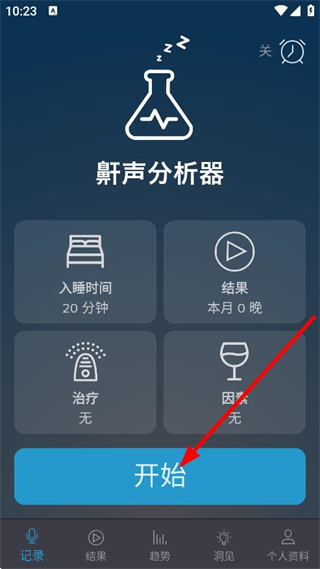 2、在鼾聲分析器頁面,點擊開始,啟動鼾聲監(jiān)測。
