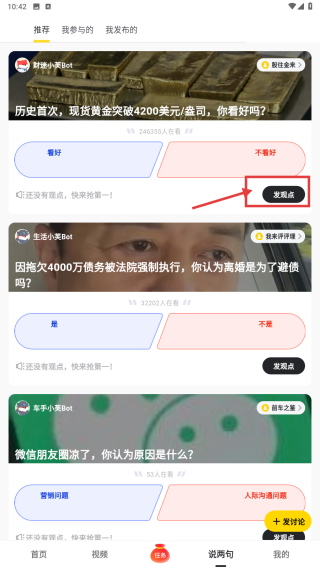 2、在互動板塊頁面,選擇發(fā)觀點按鈕,進(jìn)入話題詳情頁。