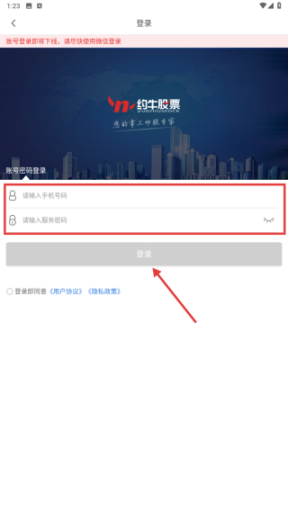4、在賬號(hào)密碼輸入界面,輸入手機(jī)號(hào)和密碼后點(diǎn)擊登錄按鈕,完成賬號(hào)登錄操作。