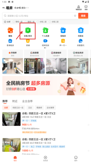 2、在租房功能頁面,選擇合租·單間分類,瀏覽合租單間房源列表。