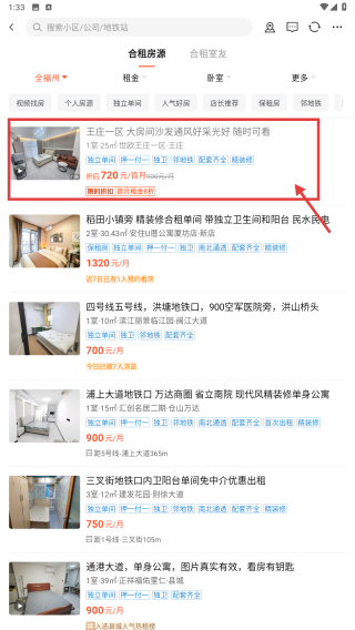 3、在房源列表中,點(diǎn)擊目標(biāo)房源如王莊一區(qū)大房間沙發(fā)通風(fēng)好采光好隨時可看,進(jìn)入房源詳情頁。
