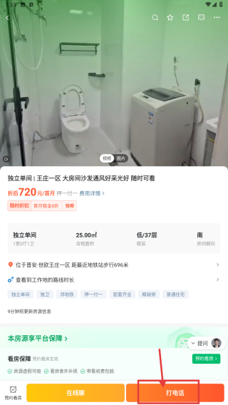 4、在房源詳情頁,點(diǎn)擊打電話按鈕,聯(lián)系房東咨詢租房相關(guān)事宜。