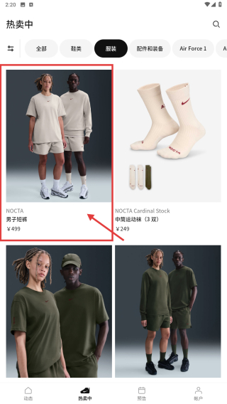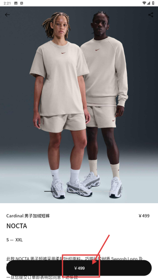 3、在商品列表中,點(diǎn)擊目標(biāo)商品如NOCTA男子短袖短褲,進(jìn)入商品詳情頁。