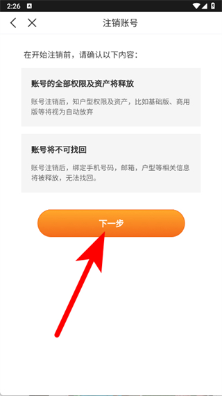 5、在注銷賬號頁面,閱讀賬號注銷相關提示后,點擊下一步。