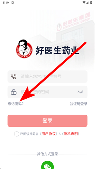 1、打開好醫(yī)生藥業(yè),進入登錄頁面,點擊忘記密碼。