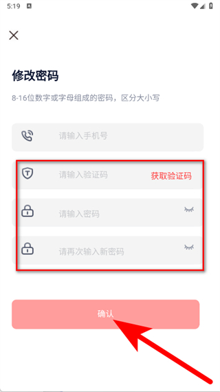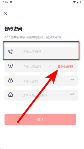 2、在修改密碼頁面,輸入手機號,點擊獲取驗證碼。