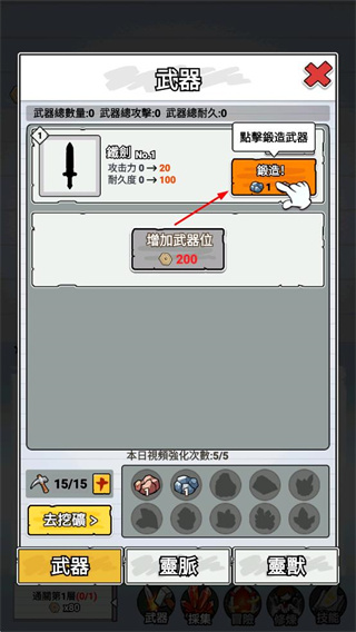 1、在武器界面鑄造武器,提升攻擊力和耐久度,為戰(zhàn)斗奠定基礎(chǔ)。