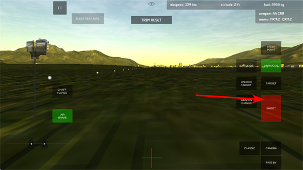 1、掌握攻擊操作,在游戲界面中,點(diǎn)擊SHOOT按鈕,學(xué)習(xí)并掌握戰(zhàn)機(jī)的攻擊操作,為戰(zhàn)斗做好準(zhǔn)備。