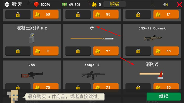 3、在商店購(gòu)買(mǎi)武器、道具,提升戰(zhàn)斗與防御能力,為對(duì)抗僵尸奠定基礎(chǔ)。