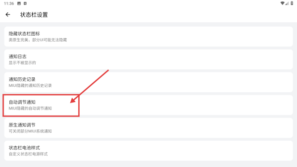 2、在狀態(tài)欄設(shè)置頁面,選擇自動調(diào)節(jié)通知選項,進(jìn)入系統(tǒng)界面調(diào)節(jié)工具頁面。