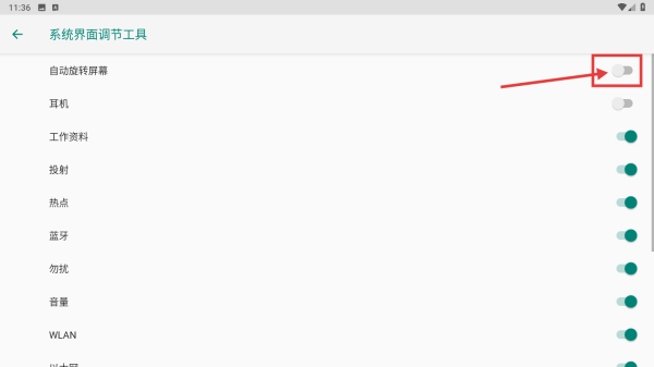 4、在功能列表頁,開啟自動旋轉(zhuǎn)屏幕功能,完成狀態(tài)欄功能調(diào)整操作。