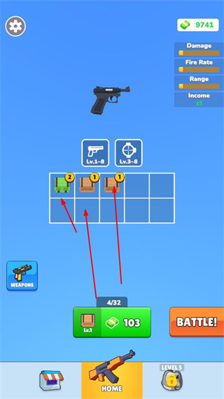 1、在合成界面,將相同等級的槍械合成升級,提升槍械的傷害、射速、射程等屬性,為跑酷戰(zhàn)斗奠定基礎(chǔ)。