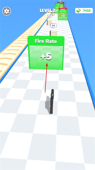 2、進(jìn)入跑酷關(guān)卡,操控槍械收集射速加成等buff,提升射擊能力,同時擊碎金幣方塊收集資源。