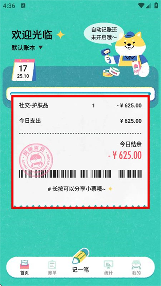 4、完成記賬后,可在首頁(yè)看到社交-護(hù)膚品等記賬小票,展示今日支出等信息。