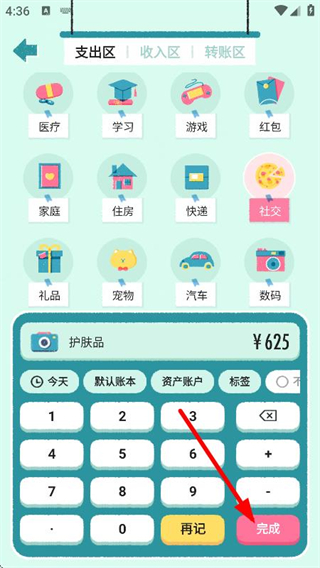 3、在記賬金額填寫(xiě)頁(yè)面,輸入金額等信息后,點(diǎn)擊完成,完成記賬操作。