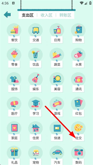 2、在記賬分類(lèi)選擇頁(yè)面,點(diǎn)擊社交的分類(lèi),進(jìn)入記賬金額填寫(xiě)頁(yè)面。