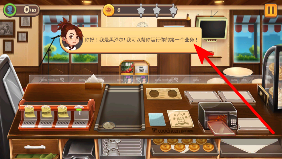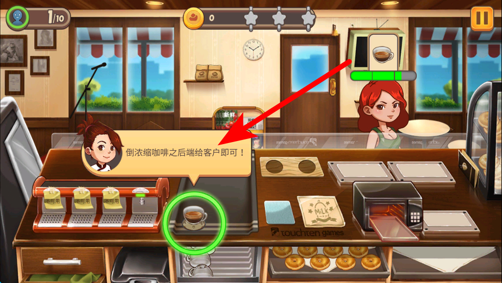1、開始時(shí)會(huì)有黑澤爾引導(dǎo)運(yùn)行第一個(gè)業(yè)務(wù),按照提示,當(dāng)有第一個(gè)客戶時(shí),根據(jù)要求,按咖啡機(jī)制作濃縮咖啡,制作好后倒出濃縮咖啡,然后端給客戶。