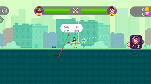 2、拉動屏幕中的角色,調(diào)整射箭的力度和角度,力度和角度信息會以氣泡形式顯示,如70%力度,13角度。