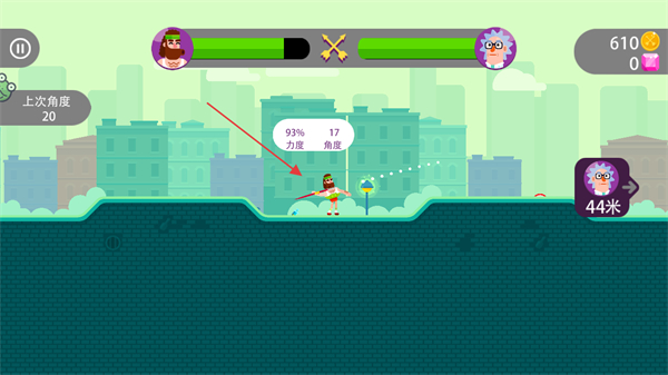 2、拉動(dòng)角色,調(diào)整力度角度,依據(jù)93%力度、17角度等信息,瞄準(zhǔn)后射出箭矢。